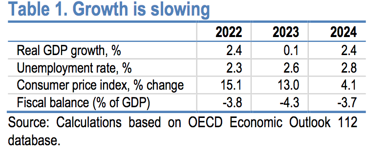 OECD'ye göre, GSYİH'nın yüzde 2,4 artması ve enflasyonun yüzde 4,1'e düşmesiyle ekonomik toparlanma 2024'te gerçekleşecektir. Fiyat artışıyla mücadele etmek için, %2'lik oran yakalanana kadar sıkı bir para politikası sürdürülmesini öneren rapor, (enflasyon hedeflerine ulaşabilmek için) devlet desteklerinin değil, hedefli olması gerektiğine işaret etmektedir.